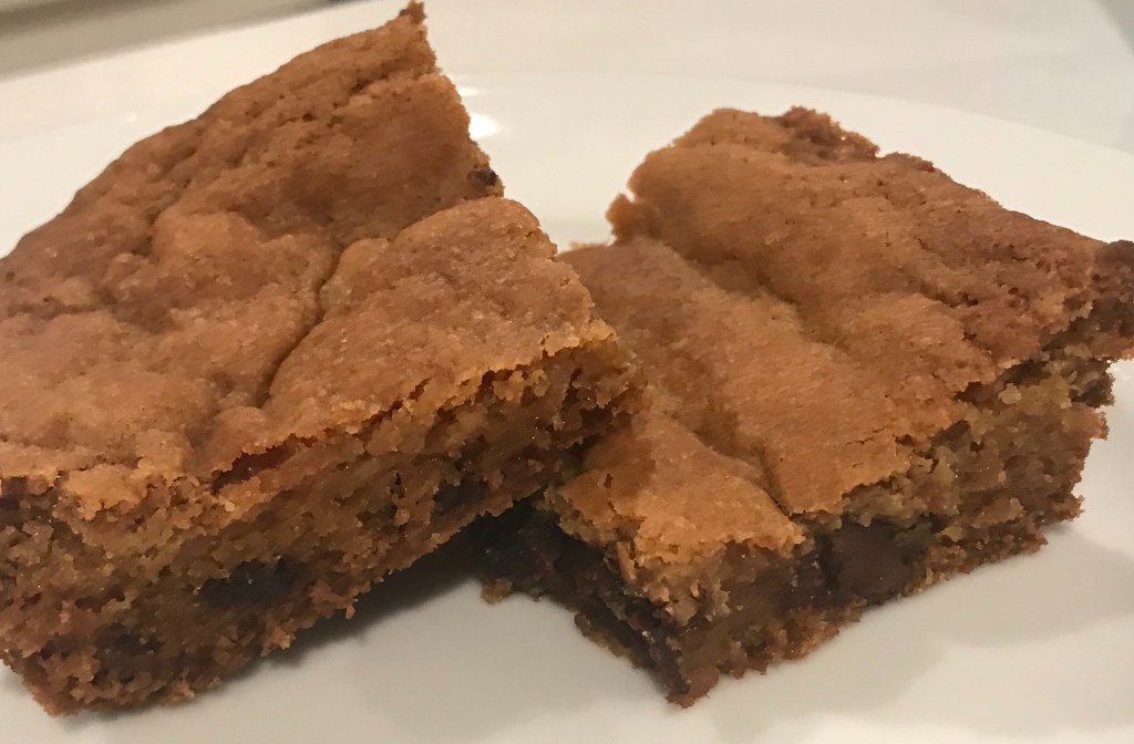 Preheat the oven to 350 degrees Fahrenheit. Prepare a 9×13 inch pan using butter or Crisco and flour. Stir together the eggs, butter, oil, and both sugars. Add Vanilla. In a separate bowl, combine the flour, baking powder, salt, and baking soda. Pour the dry ingredients into the wet and stir fully. Add the pecans. Bake in the preheated oven for 30-35 minutes or until the center is set. Let cool before slicing.