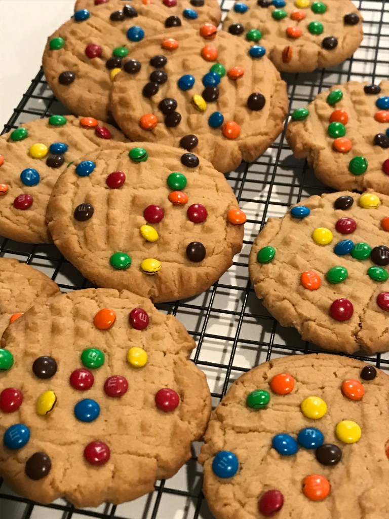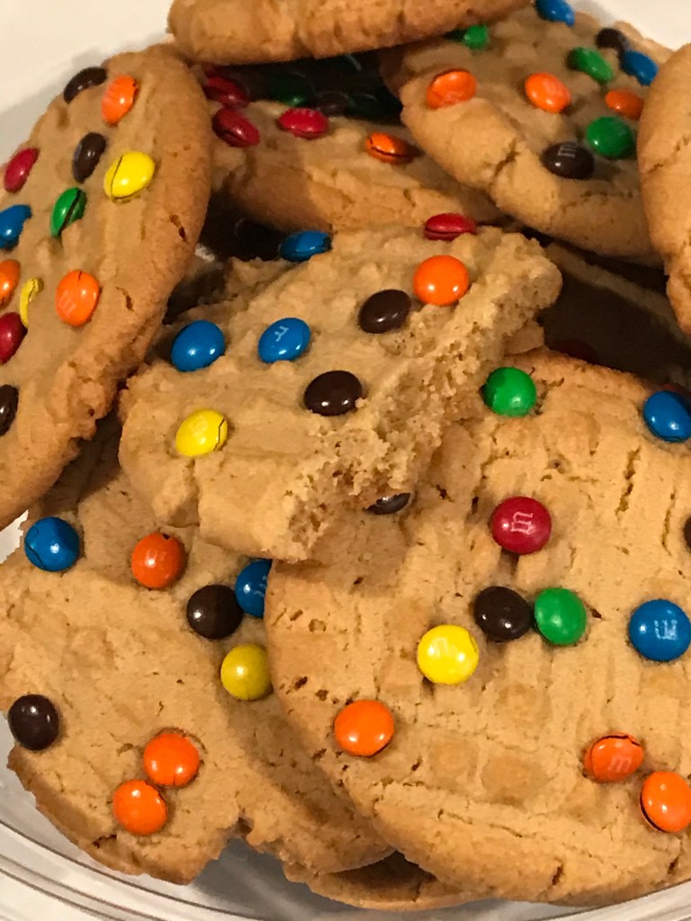 In a large mixer, cream together the butter and sugars. Add the egg. Mix well. Continue to add the following ingredients in this order while mixing in between: vanilla, peanut butter, salt, baking soda, and baking powder. Finally, add the flour. Mix fully. Roll into 2 tablespoon sized balls (very large). Leave 3 inches around each ball for spreading while baking. Place on a silicone mat lined baking sheet. Press the top of each ball using a fork. Sprinkle with mini chocolate candies. Bake in a 350 degree Fahrenheit oven for 11-13 minutes or until centers are set. Do not over-bake. Allow to cool on the pan for 5-10 minutes prior to removing.